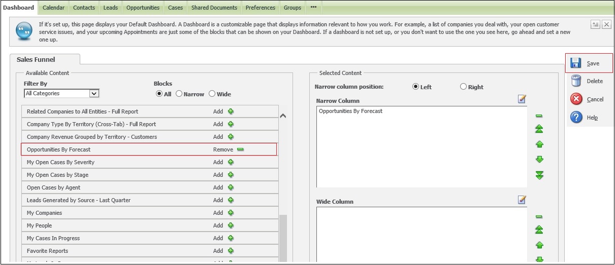 3. Select the required data to be displayed on dashboard from the Available Content panel and click on save button.