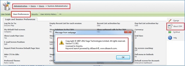 3) Click on User Preferences tab and you will get the similar screen which is visible under My CRM tab and on click of About CRM button, you will get Sage CRM version and patch information.