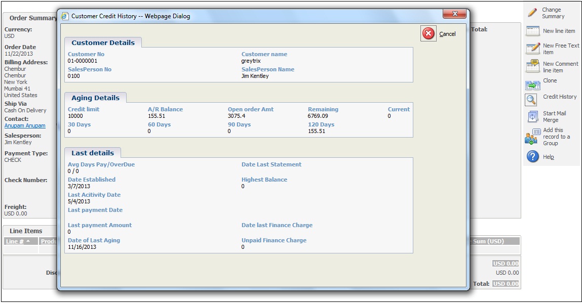 When we click on the “Credit History” button, a window will pop-up which displays the credit history for that particular customer. It displays all the relevant details in three different panels. Topmost panel contains the customer details, Middle panel shows the “Aging details” and lowermost panel displays “Last details” (as shown in below screenshot).