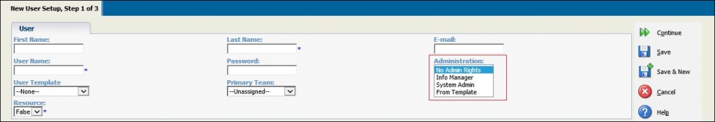 4. From Template – ‘From Template’ provides with the flexibility of assigning administration rights to the user set in the template selected from the User Template drop down list.