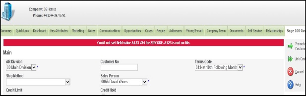 3. Once zip code is created then user can use that zip code for promoting Company from Sage CRM to Sage 100.