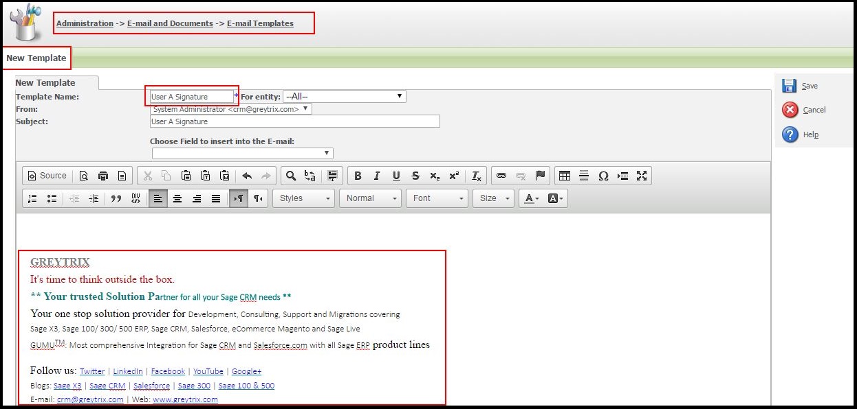 - User A: Create a new template in “Email Templates” section and add the required signature within the message body.