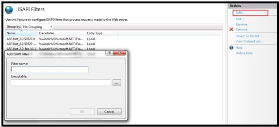 - Next, go to IIS |Default Website | ISAPI Filter and click on Add button to add ISAPI Filter.