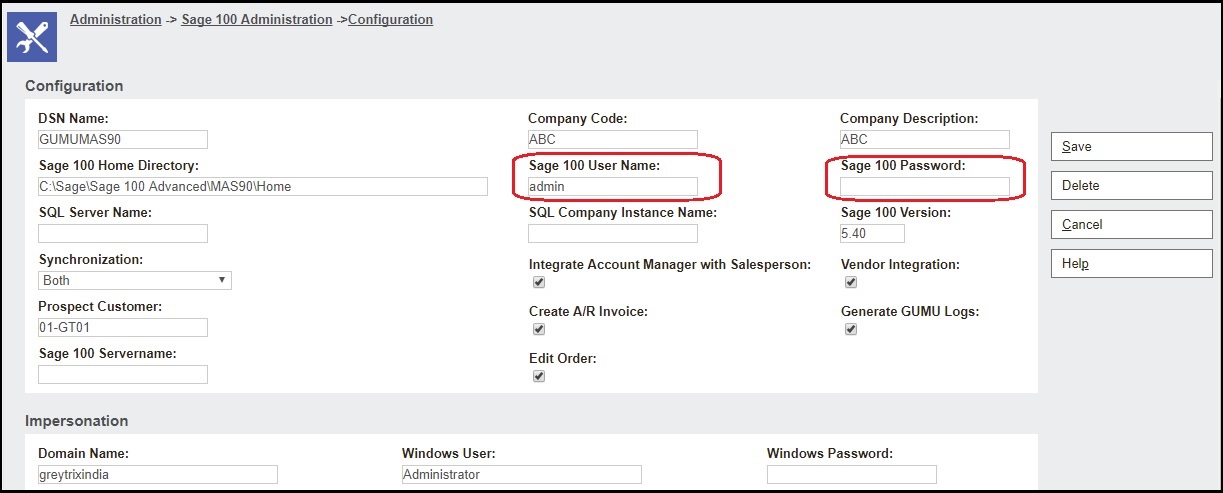 Our GUMU™ Sage CRM – Sage 100 integration requires a dedicated Sage 100 user for writing data into Sage 100. In Sage 100 ERP, there is functionality called “Unified Login” by which user can make use of windows domain user to login into Sage 100. When using unified logon, separate logons and passwords are not stored within Sage 100 ERP. Instead, Sage 100 ERP authenticates the user’s Windows logon and password. Users are not required to re-enter their logon name when accessing Sage 100 ERP after logging on to their Sage 100 workstations on their PCs.