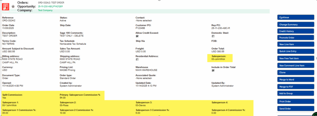 - Effortless synchronization of all commission details to Sage 100 during Sales Order promotion.