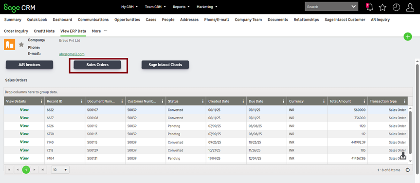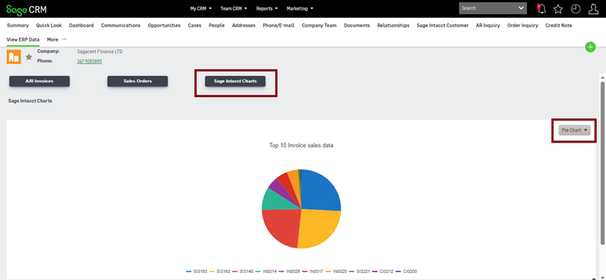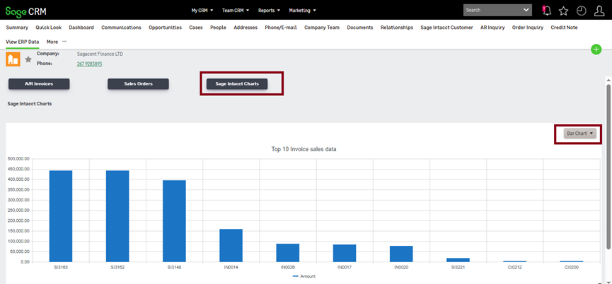 Earlier, Sage Intacct sales orders, invoices, and historical sales data were displayed in separate standard table grids within Sage CRM. With the latest enhancement, this information is consolidated into a single View ERP Data screen, using advanced Kendo Grids and interactive charts to provide a more intuitive, visually rich, and user-friendly experience.