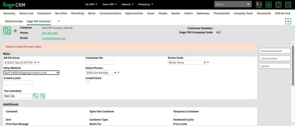 Although this issue can stem from multiple factors, it most commonly indicates that Sage 100 Business Objects are not being created successfully within Sage CRM. To diagnose this, we recommend validating whether the Sage 100 Business Objects are functioning correctly in Sage 100 itself.