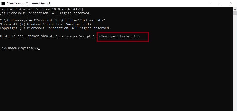 If the script fails to execute and returns a “<NewObject Error: 15>”, it indicates issues with the Sage 100 Workstation installation or related components.
