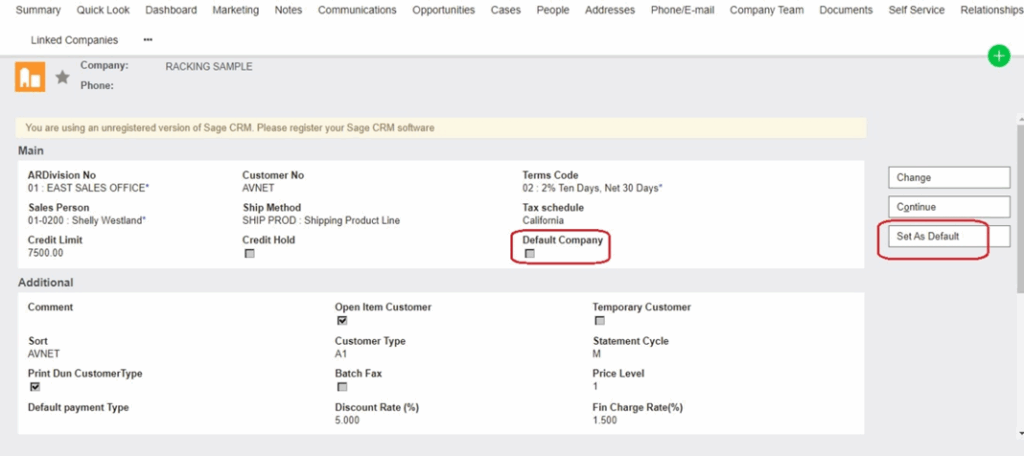 • System values such as tax schedule, pricing, terms, and credit rules automatically populate from the Default account.