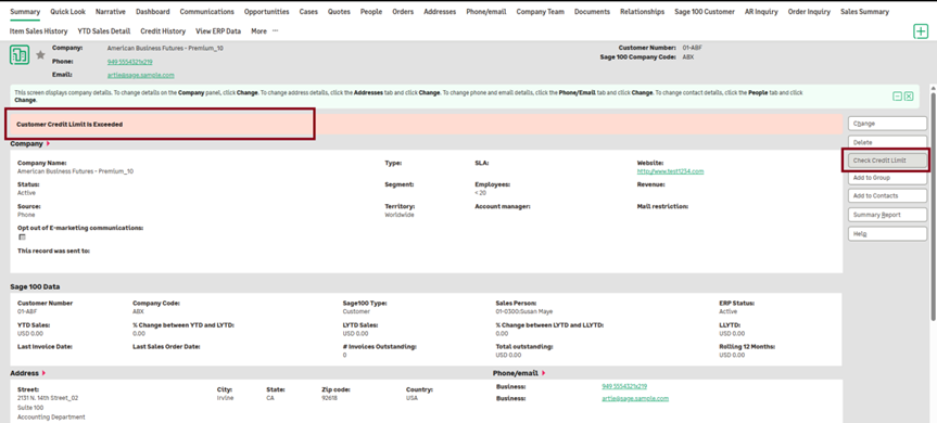 - A “Check Credit Limit” button is available on the Company Summary screen in Sage CRM.
