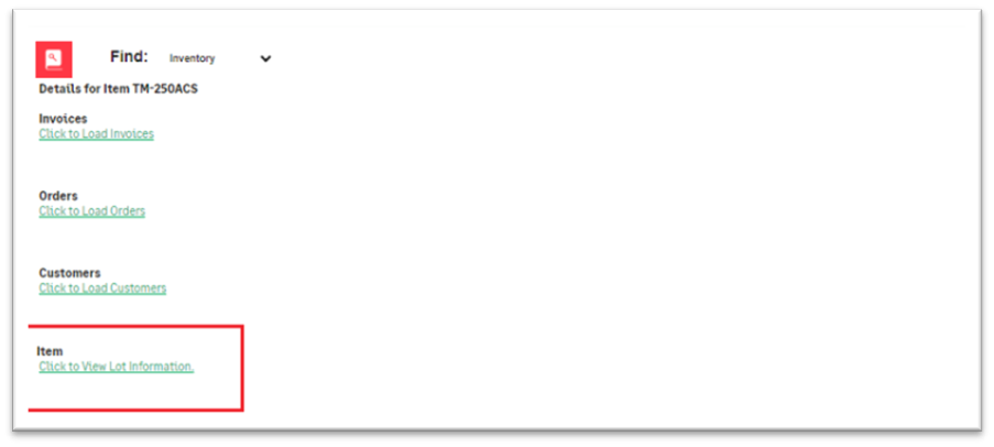 In the standard Sage CRM – Sage 100 integration, there is a Find Inventory screen. When a CRM user clicks on the Item Code hyperlink, an option to view the Lot information is displayed. When the user clicks this link, a Kendo Grid opens and displays the lot number details specific to the selected item.