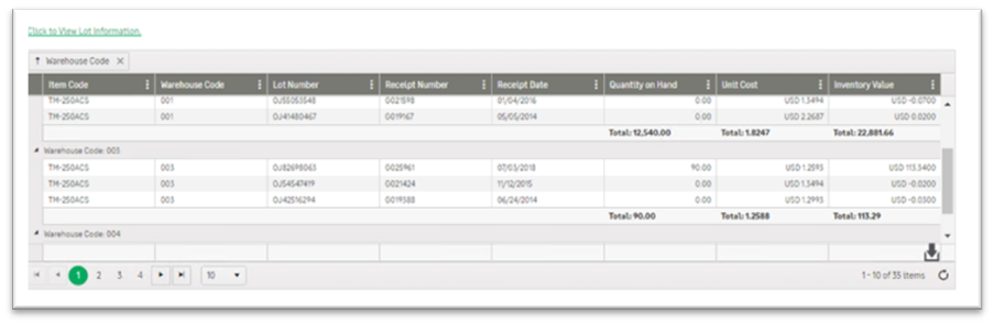 The grid can also be used for reporting and analysis, enabling users to review lot number information based on inventory items for better inventory planning and decision-making.