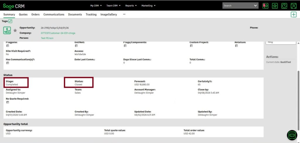 GUMU detects the completed order status and updates the linked opportunity in Sage CRM: