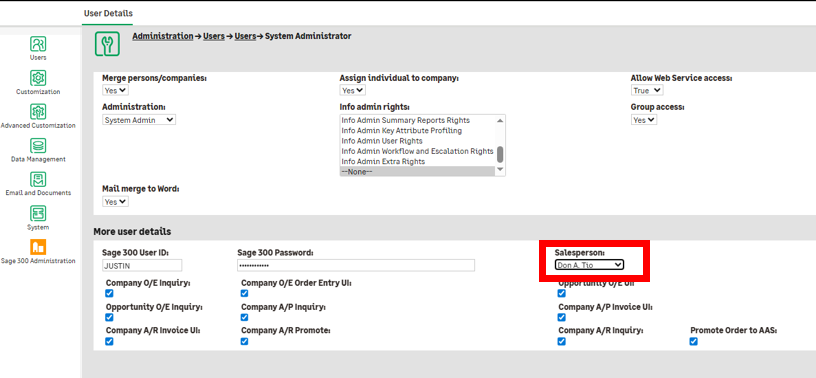 To support this requirement, we introduced a new selection field — “Salesperson” at the User level in Sage CRM.