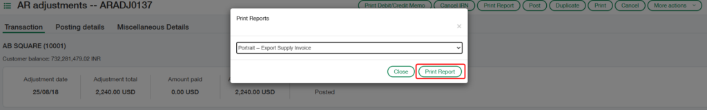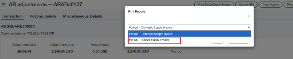 After clicking the “Print Debit/Credit Memo” button (Refer Fig 1), a dropdown will appear displaying a list of available report names (Refer Fig 2). From this list, the user must select “Portrait — Export Supply Invoice” and then click the “Print Report” button (Refer Fig 3) to generate the Export Supply AR Adjustment credit/Debit report in the chosen format, as shown in the screenshot below (Refer Fig 4).