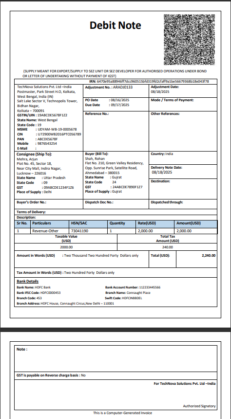 This Credit/Debit Memo, part of the AR adjustment process, is issued for domestic supplies but was generated for export or SEZ supplies under bond or LUT without IGST payment, ensuring GST compliance for both domestic and international transactions.