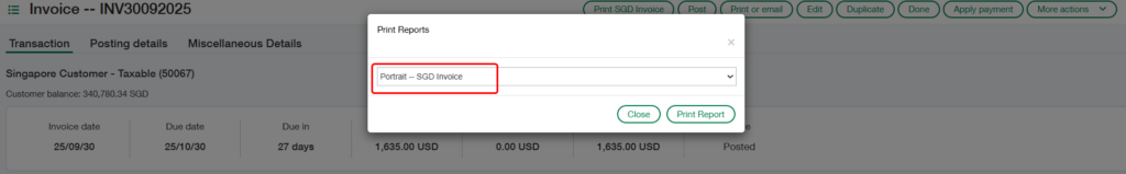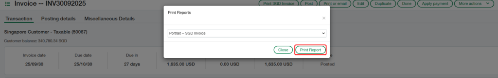 After clicking the “Print Tax Invoice” button (Refer Fig 1), a dropdown will appear displaying a list of available report names (Refer Fig 2). From this list, the user must select “Portrait — SGD Invoice” and then click the “Print Report” button (Refer Fig 3) to generate the AR Invoice Tax Reports report in the chosen format, as shown in the screenshot below (Refer Fig 4).