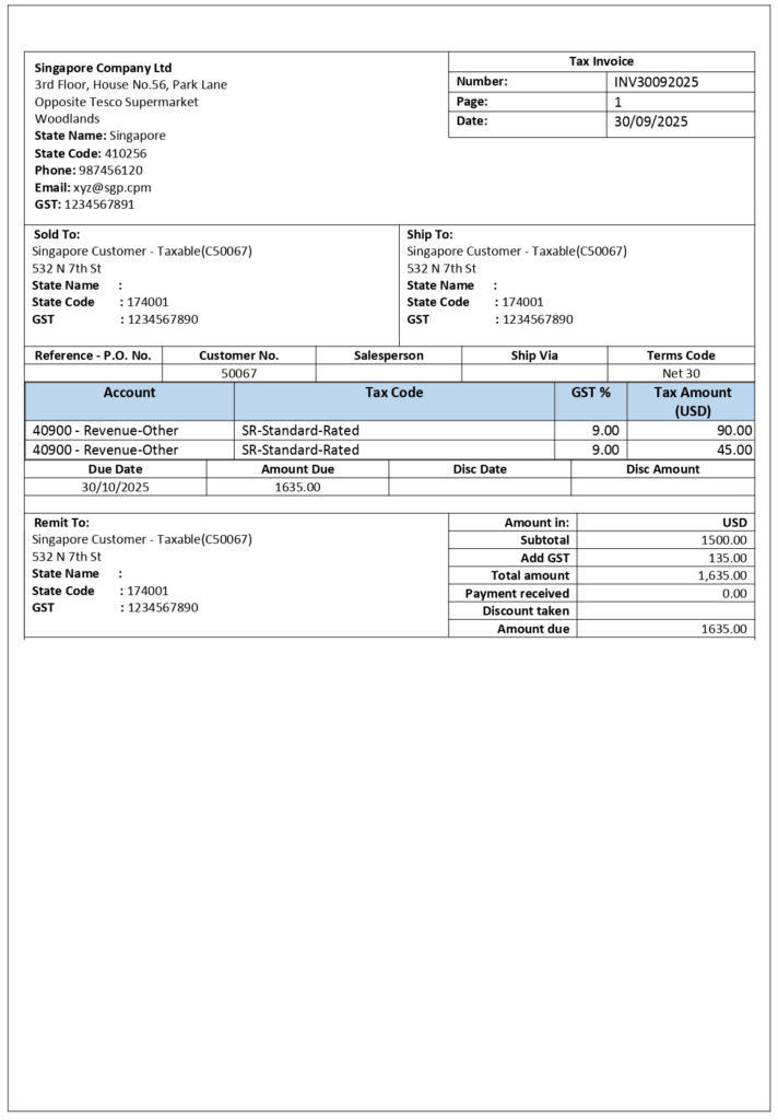 This Tax Invoice is issued for a taxable supply in Singapore. It serves as a legal record of the sale, includes the calculation of Goods and Services Tax (GST), and ensures compliance with Singapore’s GST regulations. As the transaction falls under customer accounting, the responsibility for reporting and accounting the GST lies with the recipient.