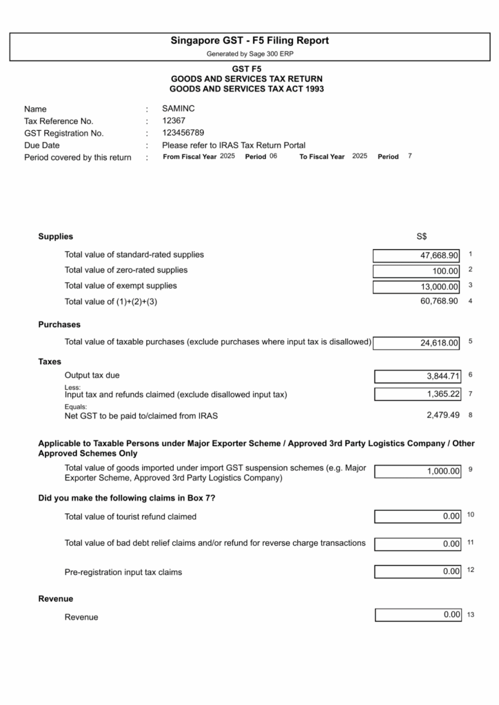 When the “Print” button is clicked in the GST F5–F8 Filing screen, Sage Intacct automatically gathers all relevant GST data for the selected filing period, including taxable sales, purchases, input tax, and output tax. The system then validates this data to ensure that all fields are complete and calculations are accurate before generating the report.