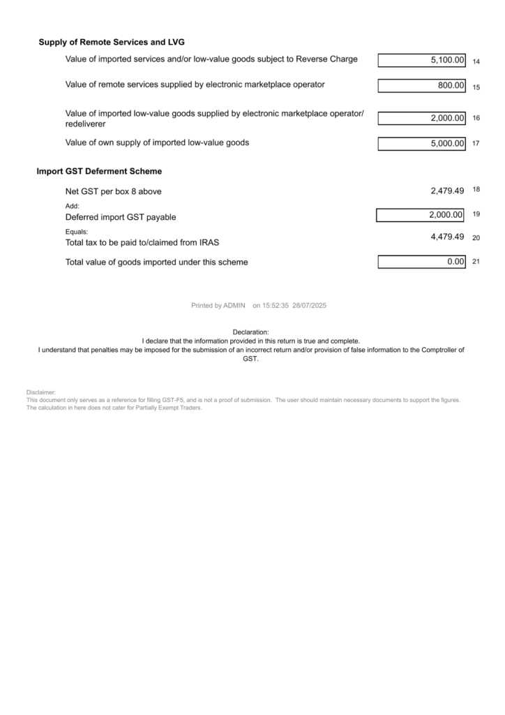 The Print option in the GST F5–F8 Filing screen serves as more than just a reporting tool — it acts as a final checkpoint before submission. By transforming complex GST data into a clear and structured report, it allows users to quickly verify figures, identify discrepancies, and ensure every transaction aligns with IRAS standards. This not only enhances reporting accuracy but also strengthens compliance confidence.