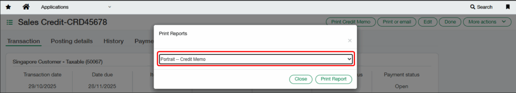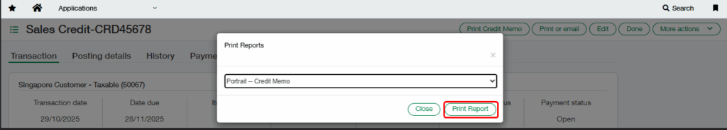 In the OE module, you can generate the OE Credit Note Report in just a few steps. Select the transaction and click the “Print Credit Memo” button (Refer Fig.1). A dropdown will appear with a list of available report (Refer Fig. 2).From the list, choose “Portrait – Credit Memo”. Click the “Print Report” button (Refer Fig. 3). The system will then generate the OE Credit Note Report in the selected format (Refer Fig 4).