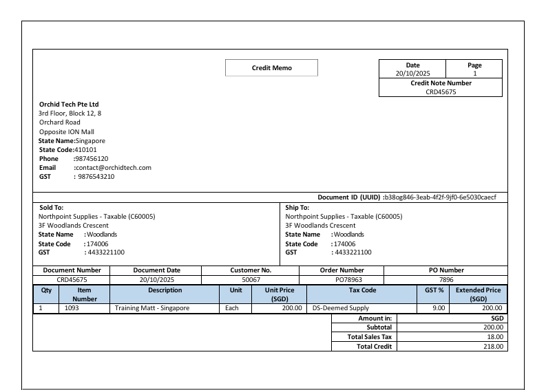 The report also includes: - The Document ID (UUID) is automatically generated when the e-Invoicefor the Credit Note is uploaded and generated through the e-invoicing portal.