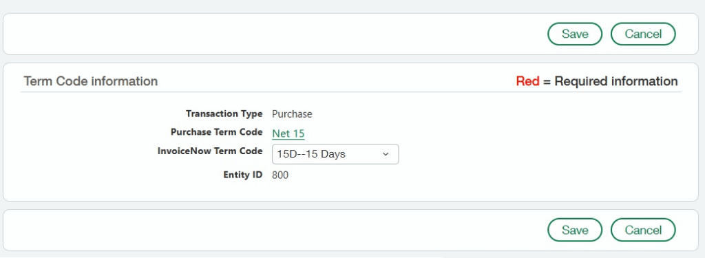 Then, select the matching InvoiceNow Term Code from the compliant picklist, which follows Peppol BIS Billing standards tailored to Singapore’s requirements. Upon saving, the Entity ID will auto-populate.