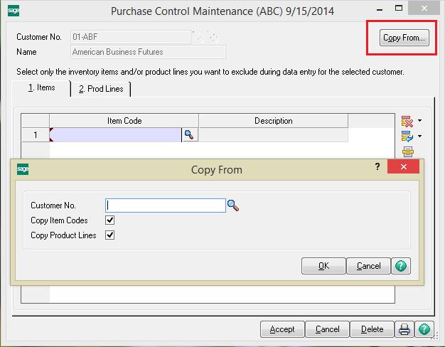 Select the record from which you want to copy information. If you selected Customer in the Enable Purchase Control of Items field in Sales Order Options, enter the customer number or click the Lookup button to list all customer numbers.