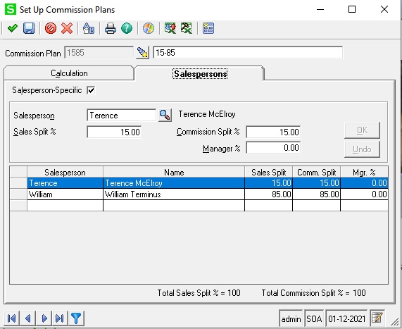 A commission is then allocated to the salesperson at the time of invoice entry. The commission plan can be assigned to any number of salespeople. A salesperson can be assigned to one or more commission plans and can split the calculated Commission or the sales amount credited for historical purposes with other salespeople in more complex situations.