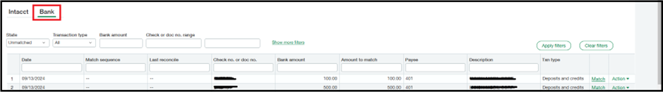 GUMU™ reads the bank feed files stored in Google Drive and imports the transactions into Sage Intacct. At this stage, the transactions are synced but not yet visible in the bank register.