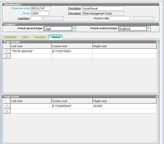- Lastly Report tab it is possible to parameterize the page format information that will be used in the report. A free text must be entered between ” ” (“My Financial data extraction”) contrary to a formula field ([F: TXS] DES: Financial data extraction title) or call to a variable (GUSER: current user). These different expressions can be combined.