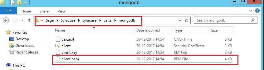 After re-installation of MongoDB, “Client.pem” file will generate in D:\Sage\Syracuse\syracuse\certs\mongodb(In this case I have install mongodb in D drive)