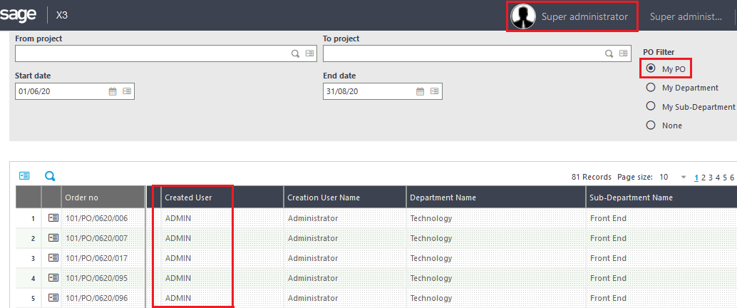 As you can see, when admin user has selected “My PO” option in inquiry screen, only POs created by him are getting displayed but when he has selected “None” option in the below screenshot, he is able to see all the POs which are created by other users also.