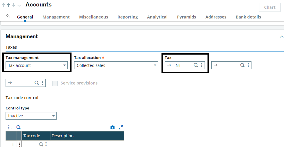 Set ‘Tax Management’ field as ‘Tax account’ and Tax as ‘ANSTD’ or any tax code we can set here. Refer below screenshot:
