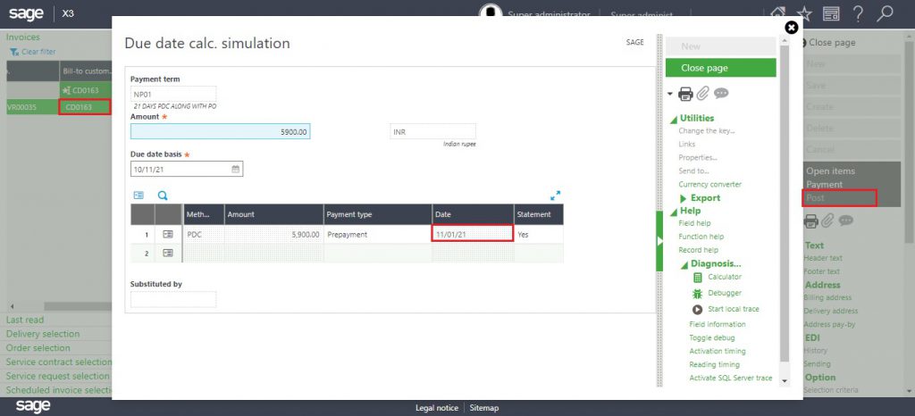 Due date is defined in every Sales/Purchase transaction in Sage X3 on the basis of Payment terms and Payment terms is a mandatory field in every transaction. One of our client requested to restrict Sales Order transaction on the basis of due date. Number of days beyond which if payment of posted Sales Invoice is due for a customer, then order process will be restricted for that customer. In simple words, a Validation is required where if the defined date is exceeded beyond the defined due date in the Sales Invoice transaction and payment is not done against that invoice then the user should not be allowed to create Sales Order for the same customer.