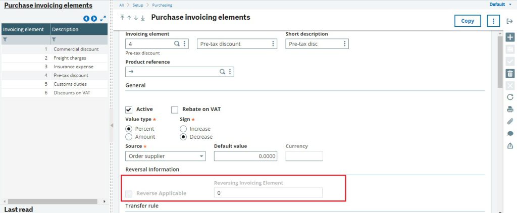 We have to add “Reverse Applicable” checkbox in setup screen of Invoicing Elements for Purchase.