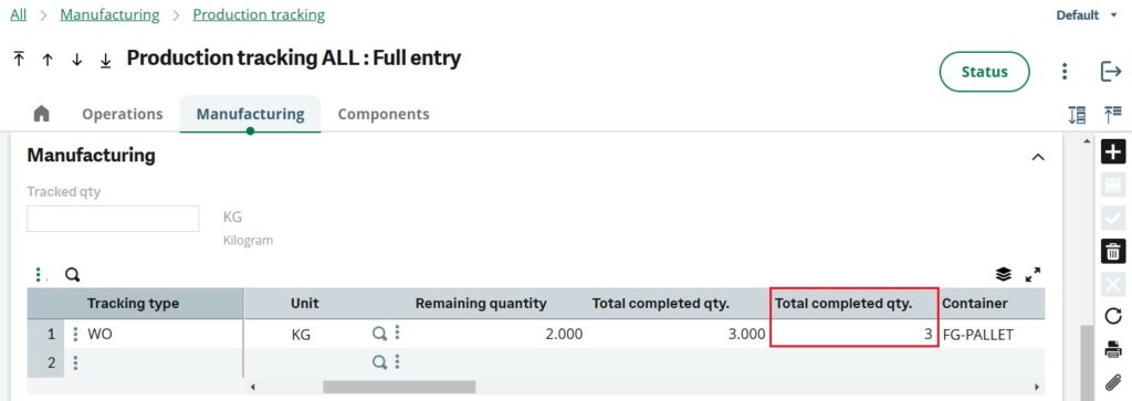 After work order, we have created production tracking – 1012503MTK00000001 against the above work order – 1012501MFG00000026 with 3 quantities and LOT0001. That means it is a partial tracking.