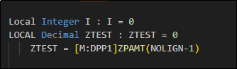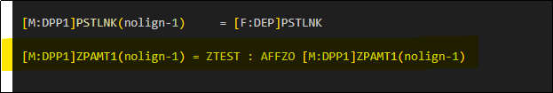 Assign the field [M:DPP1]ZPAMT1(NOLIGN-1) with the ZTEST variable as shown in the example below.