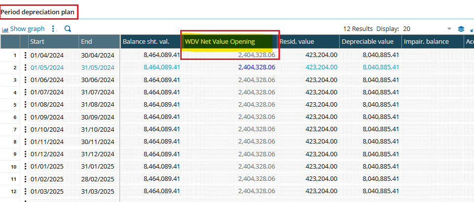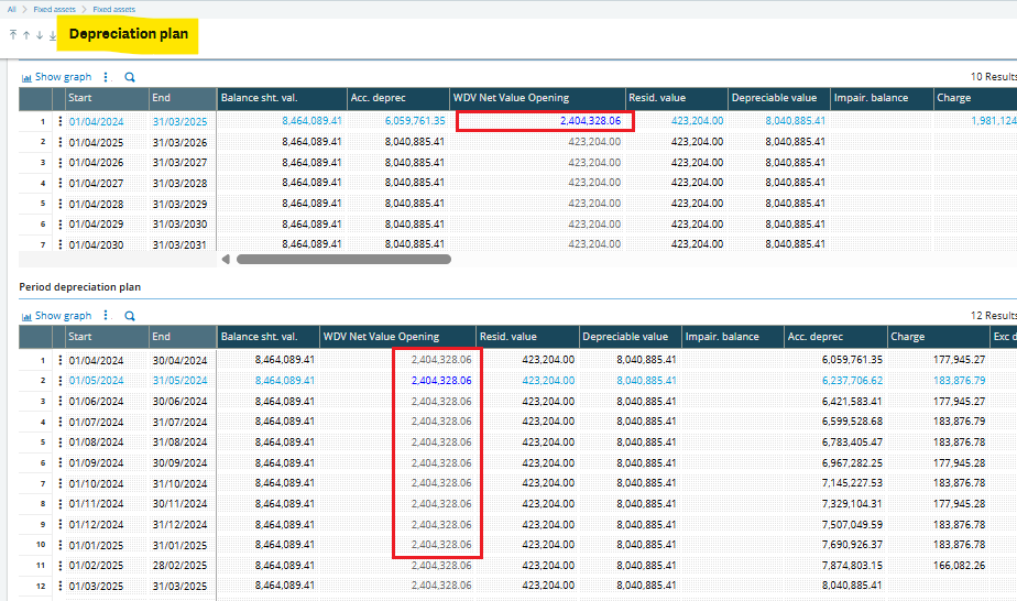 After making the changes, validate the results by navigating to the Depreciation Plan screen. When you click on any line in the FY Depreciation Plan grid, the corresponding value should now appear in multiple lines of the Period Depreciation Plan grid.