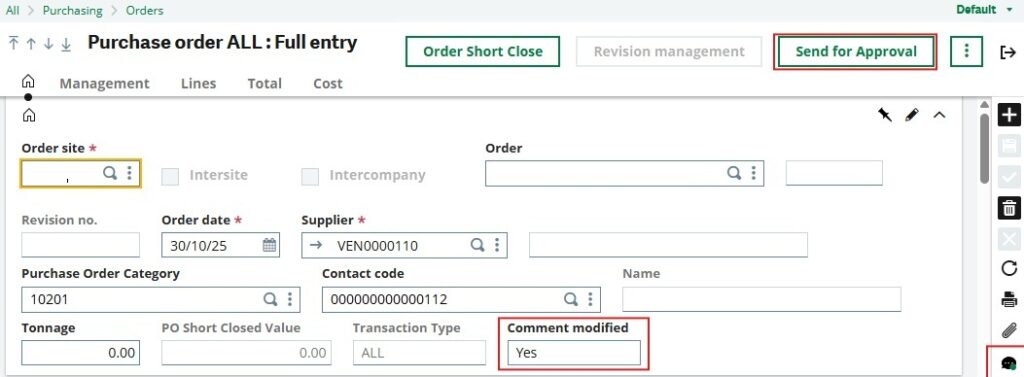 If the screen corresponds to a PO and a change is made in the Comments section, the script updates the ‘Comment Modified’ field to ‘Yes’ and sets the Signed flag to 0, which re-enables the ‘Send for approval’ button on the PO screen. Otherwise, it sets the value to ‘No’.
