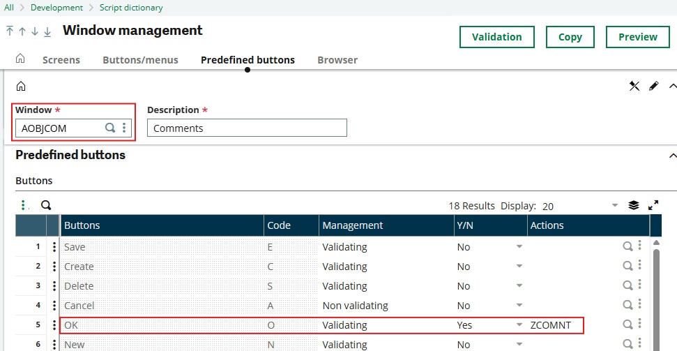 Opened the Comments window (AOBJCOM) and assigned the ZCOMNT action to the predefined ‘OK’ button, as shown in the screenshot below. Then saved the configuration and performed a global validation of the window.