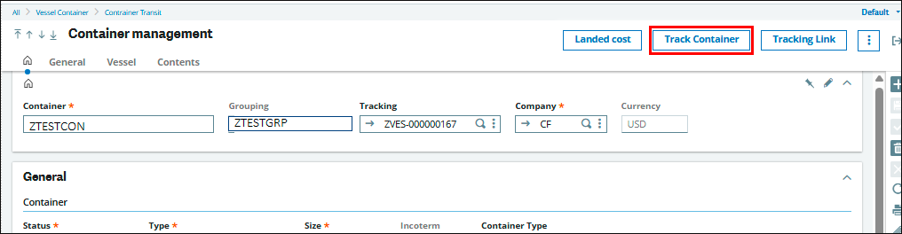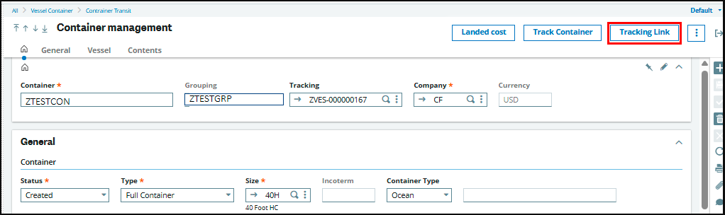 A tracking link on the container screen allows users to open live container tracking details from the external platform when deeper visibility is needed. - Container tracking inquiry screen: