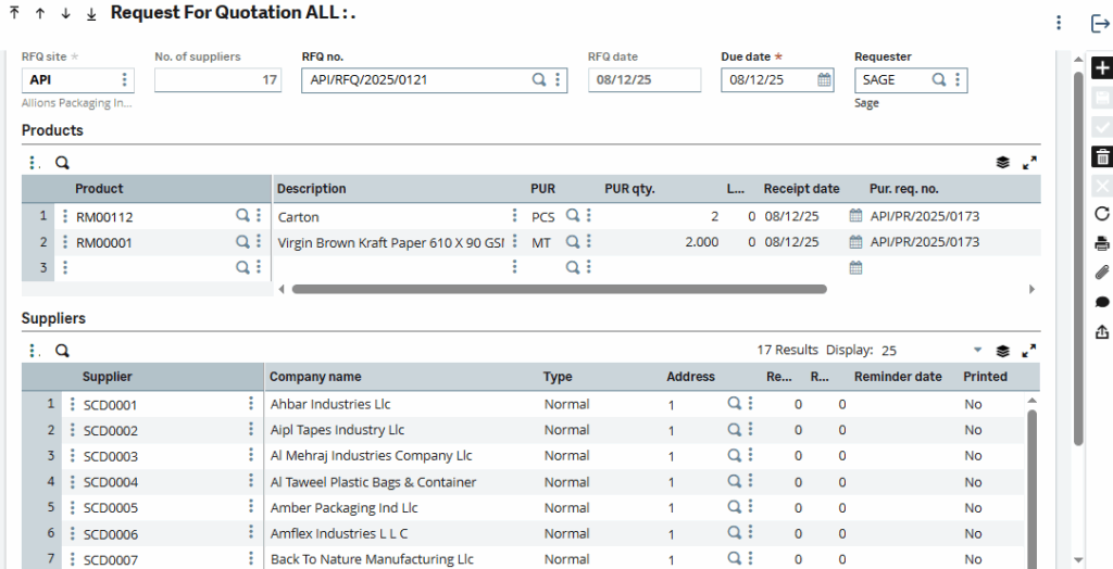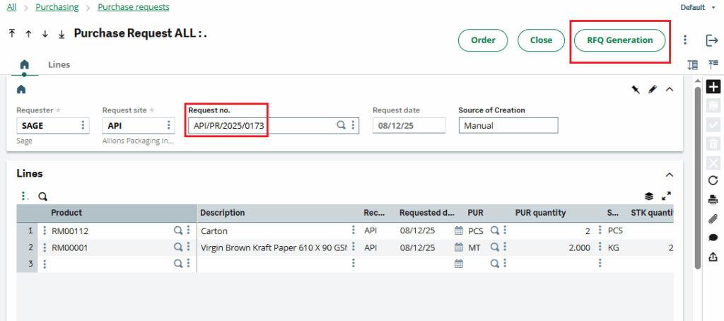 As demonstrated above, a single RFQ (Request for Quotation) supports multiple products from purchase request in Sage X3.