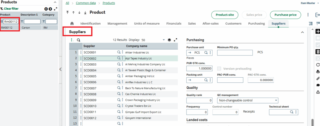 Product RM00112: Supplier Details Tab