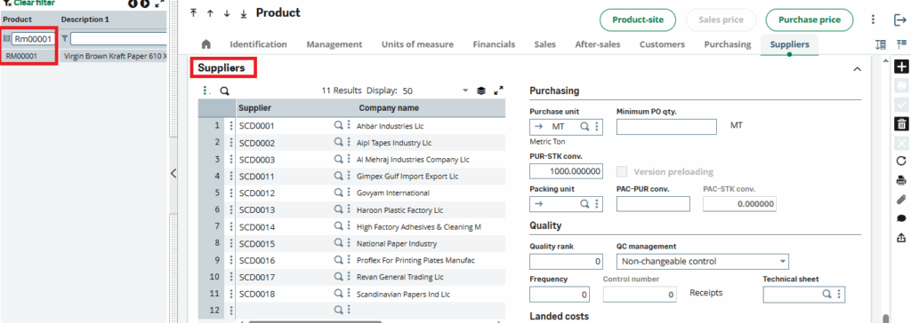 Product RM00001: Supplier Details Tab
