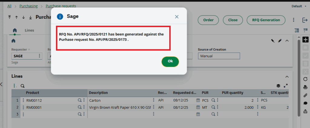 After clicking the RFQ Generation button on the purchase request screen, a pop-up appears confirming that the RFQ was generated successfully (see Fig. 4).