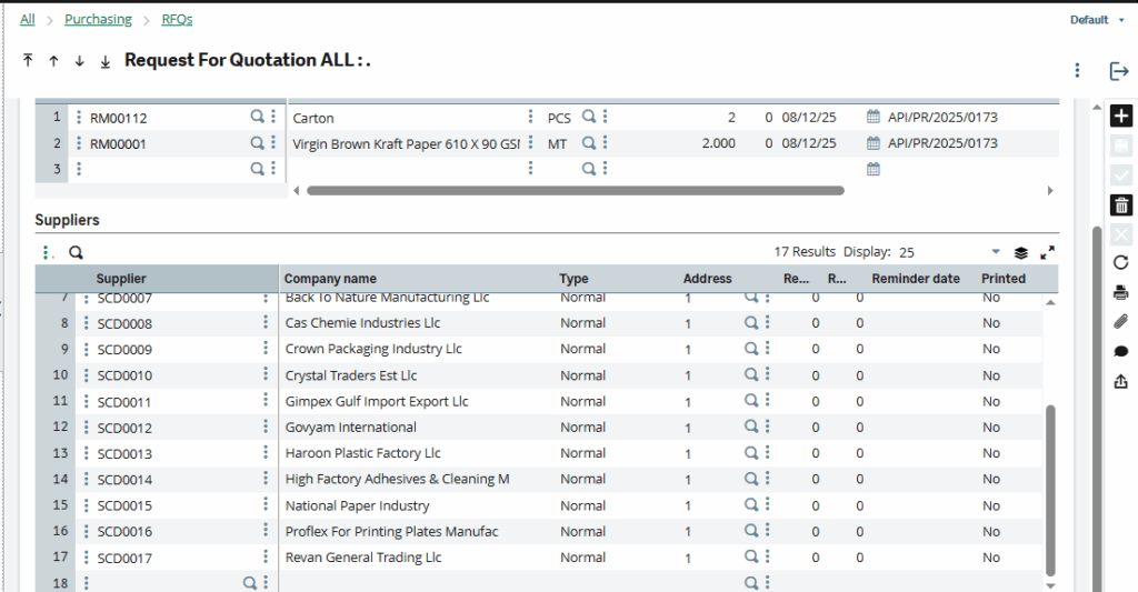 In the Product Masters for RM00112 and RM00001, suppliers are assigned in the Supplier tab. During RFQ creation, the system automatically retrieves the top ten suppliers from this tab to generate the RFQs, as shown in Figures 2 and 3.)