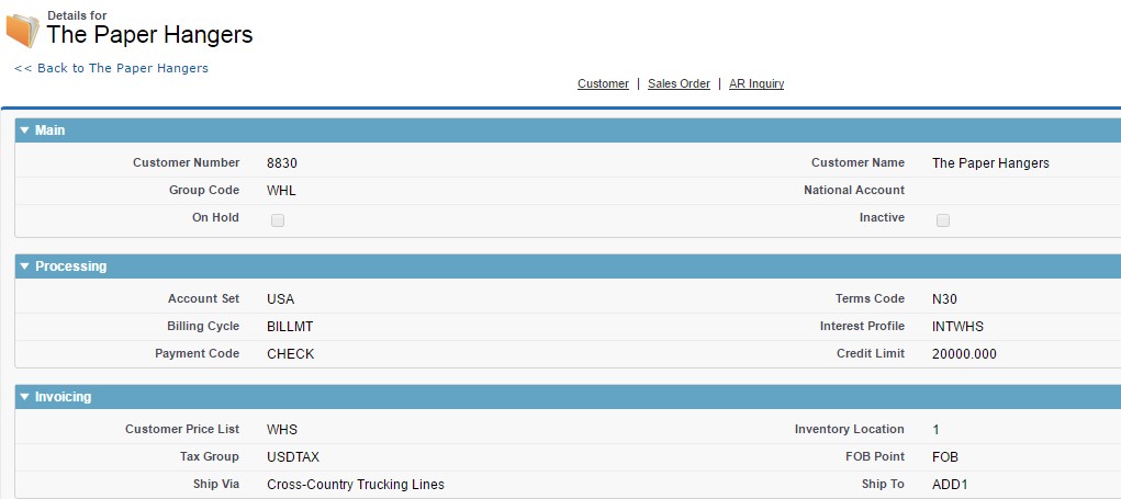 Customer: You can view a detailed real time information of an integrated Customer by clicking on the Customer No. link/ERP Details button in the Accounts page of Salesforce. By default, the page displayed is that of Customer details. The screen also provides you with various tabs for viewing additional details like Orders and Invoices.