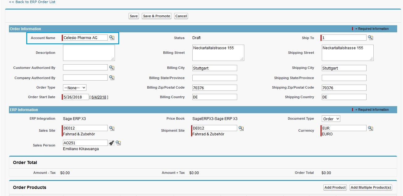 Promote Sales Order from Salesforce to Sage Enterprise Management
