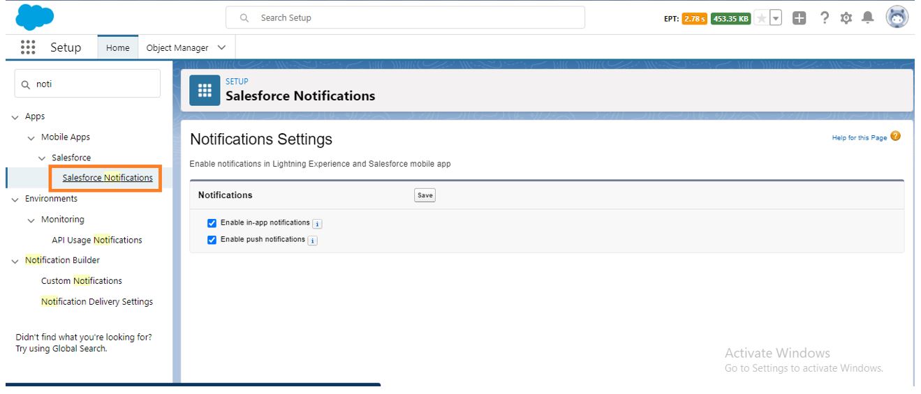 - Once Custom Notification type saved, Now type Salesforce Notification in Quick Find Box.